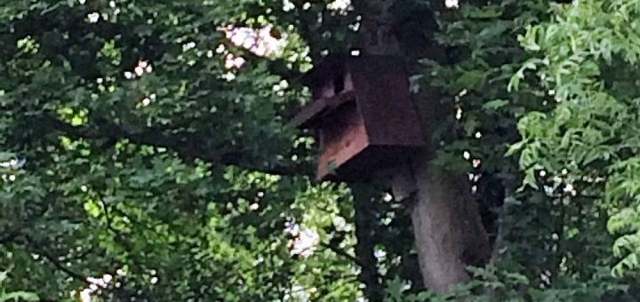 The owl box has been reinstated high on an ash tree after it was blown down in high winds a...